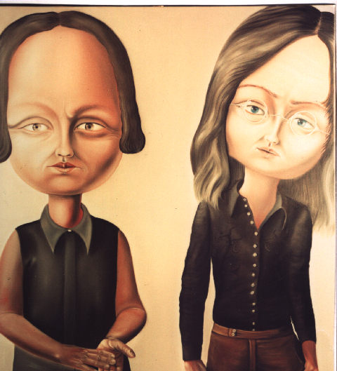 Doch zarter zeigt sich Sehnsucht und Erinnerung des Mädchens an die einstige Liebe, den Mann und den Traum – hinter ihr, an einer Kirche im fernen Georgien. Und kontrastierend dazu das 30 Jahre zuvor entstandene Bild – als Dialog von Leonce und Valerio mit dem großfigurigen Bild der beiden Gestalten mit ihren riesigen Köpfen, nebeneinander stehend, eher den Betrachter ansprechend.