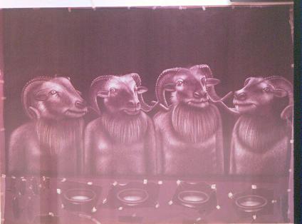 Der Moralist: Sein Bild der vier zum Mahl sitzenden Schafe (oder Ziegen) – das Motiv hat einst zu heftigen Auseinandersetzungen geführt – und im Test: „wir sollten einmal die Masken abnehmen, wir sähen dann wie in einem Zimmer mit Spiegeln den einen uralten unverwüstlichen Schafskopf, nicht mehr und nicht weniger“. Oder: „Das gewissen ist ein Spiegel, vor dem ein Affe sich quält, jeder putzt sich wie er kann und geht auf seine eigene Art auf seinen Spaß darauf aus...“ Aber dann heißt es: „Hast du das Recht, aus der Guillotine einen Waschzuber für die unreine Wäsche anderer Leute und aus ihren Köpfen Fleckkugeln für ihre schmutzigen Kleider zu machen.“ Dazu das 1996/02 entstandene Bild „Das große Fressen“, an dem sich alle beteiligen.