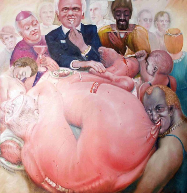 MDH. Hier im Kurfürstlichen Gärtnerhaus in Bonn ist dies die dritte Ausstellung in einer Trilogie, die „Der Eichner“ – wie er sich nennt – in der Region zeigt, denn unweit vom Ausstellungsort hat der Künstler viele Jahre gelebt. Wenn wir die beeindruckende Ausstellungsliste anschauen, so finden wir ihn mit mehr als 100 Ausstellungen an verschiedensten Orten, doch immer wieder auch in der Region. Anknüpfend an seinen damaligen Wohnsitz fand die erste Ausstellung dieser Trilogie in Sankt Augustin in der dortigen Stadtbibliothek statt („Der Eichner 30 Jahre in Sankt Augustin“, so der Titel) mit 30 Werken in einer Überschau über sein vielfältiges Schaffen. Die 2. diesjährige Ausstellung - in Verbindung mit der ersten in der Konrad-Adenauer-Stiftung – war gewissermaßen den Ikonen seines Werks gewidmet, den großformatigen Bildern, die ob der für den Eichner charakteristischen schonungslos dargestellten Realitäten wiederum heftige Reaktionen auslöste: drei Bilder wurden nach der Eröffnung aus der Ausstellung entfernt. Dies geschah nicht zum erstenmal, doch darüber wie über die Vielseitigkeit des Künstlers und die Reaktionen in der Presse können Sie sich in ungeahntem Umfang im Internet informieren.
