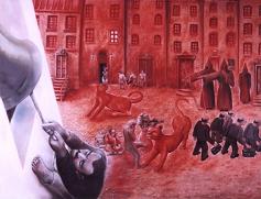Doch wenn Büchner pathetisch sagt: „Für Menschenrecht und Menschen-Freiheit zu sterben, ist höchst erhabner Mut, ist Welterlöser-Tod“, so stellt Eichner dagegen Vollstreckung und Exekution, mag man sich noch so sehr am Glockenseil festhalten. Und wenn im Bild ein Mensch wie auf Stelzen einen gewaltigen Schritt über die kleinen unter ihm tun möchte, so heißt es: „Die Schritte der Menschheit sind langsam, man kann sie nur nach Jahrhunderten zählen, hinter jedem erheben sich die Gräber von Generationen“.